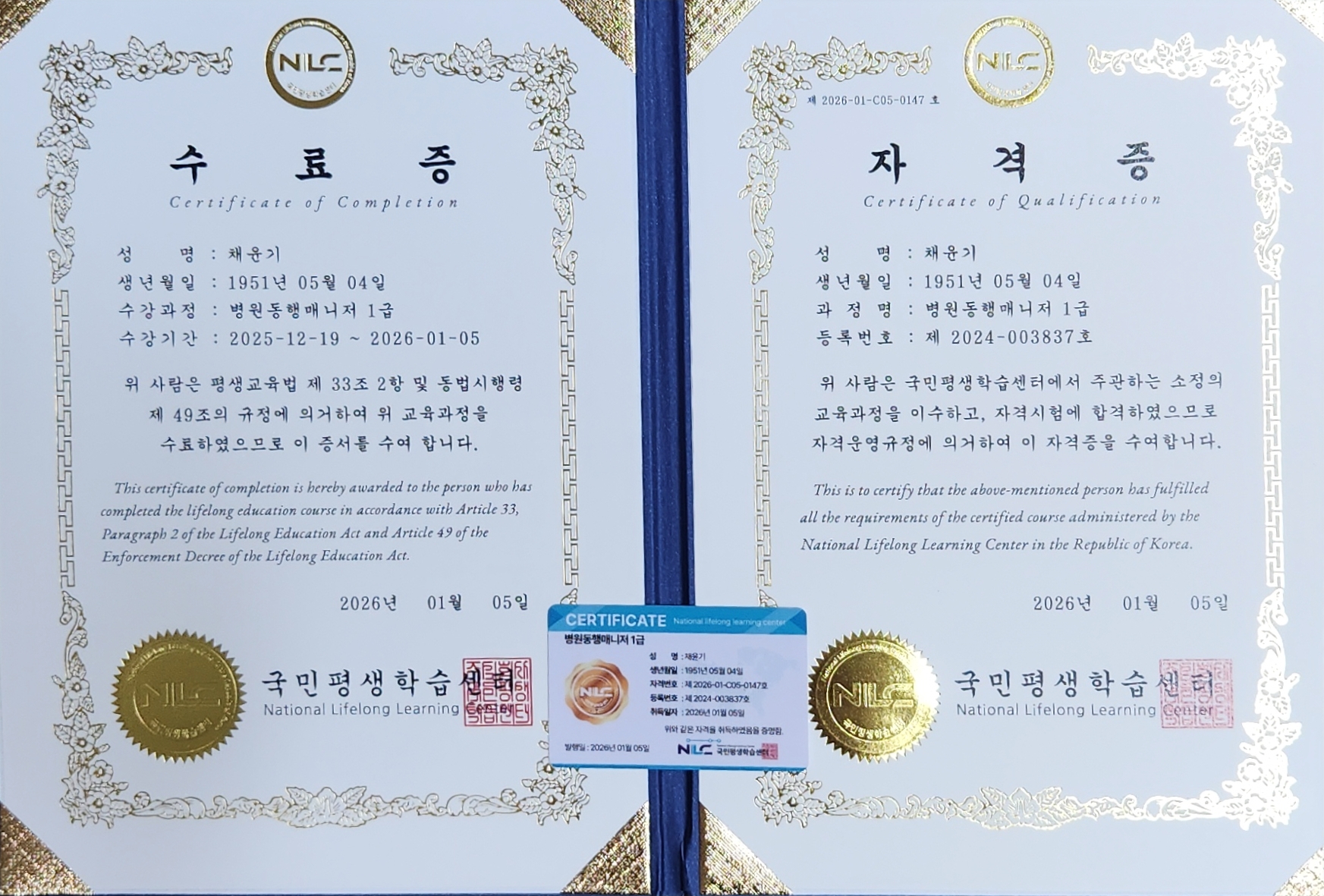 2014년말 58세에 정년 퇴직후 전기기사2급 자격으로 건물관리 기전과장 근무를 해오다가 2022년 부터는 소장으로 근무하게 되었어요. 마침 당사 미화여사가 필요하여 모집 공고를 내고 이력서를 검토중 "병원동행매니저 1급"을 소지하신 분의 이력서를 보게 되었고 궁금증이 지속되면서 인터넷을 검색하였으며 교재를 보고 강의를 듣다보니 앞으로도 많은 소요처가 있을 것으...