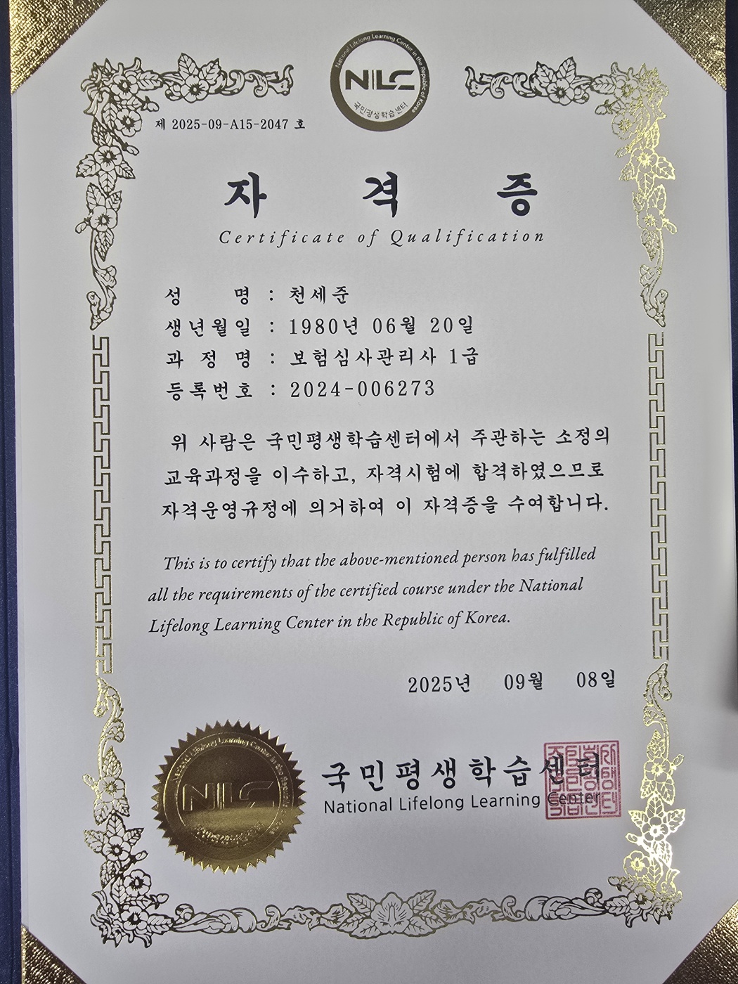 합격. 자격증 교부 받음
